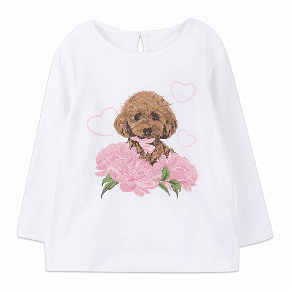 Яркий принт с изображением щенка, окруженного розовыми пионами и сердечками, добавляет игривости и радости в повседневные наряды. Дизайн привлекает внимание и подчеркивает индивидуальность ребенка. Белый цвет позволяет легко сочетать его с другими предметами гардероба, создавая стильные и практичные образы.