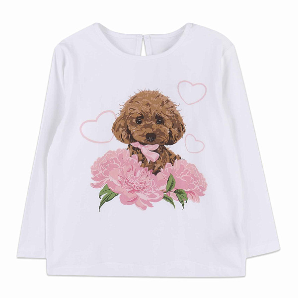 Модель выполнена в белом цвете с очаровательным принтом, изображающим собачку и нежные розовые цветы. Такой дизайн понравится маленькой любительнице животных и станет красивым и аккуратным акцентом в образе.
