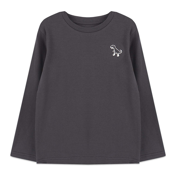 Лонгслив выполнен в темно-сером цвете с небольшим принтом динозавра на груди, что добавляет стильный акцент. Универсальный оттенок позволяет сочетать его с любой одеждой. Манжеты и нижний край имеют аккуратные подгибы, которые сохранят форму даже после многократных стирок.