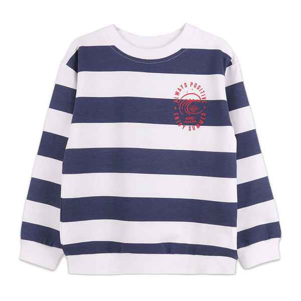 Трикотажная футболка для мальчиков с длинным рукавом. Изделие свободного кроя, не стесняющего движения. Оно выполнено в морской стилистике и имеет рисунок в виде горизонтальных полос белого и синего цветов, напоминающий тельняшки матросов. У кофты круглый вырез. На поясе и концах рукавов пришиты широкие резинки.