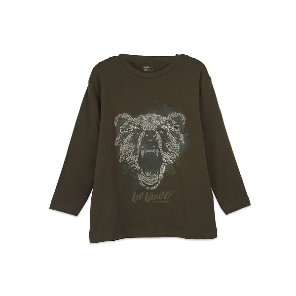 Непринужденный свободный крой лонгслива цвета хаки непременно понравится как маленьким модникам, так и их родителям. Кофта не сковывает движения, а длинные рукава дополнительно улепляют руки. Изделие пошито из натурального хлопка – такой материал хорошо пропускает воздух и впитывает влагу, обеспечивая комфортное прилегание. Небольшая добавка эластана повышает упругость и тягучесть ткани. Вырез горловины круглый, без воротника. Передняя сторона украшена принтом медведя и надписью.