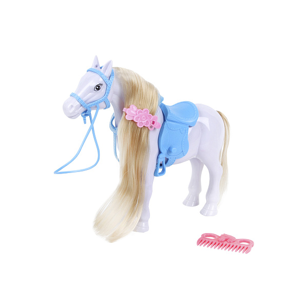 Детский игровой набор включает в себя белоснежную лошадку с золотистым гребнем. В комплекте к лошадке прилагается расческа для гребня и маленькая розовая заколка для придания прически коню. Игрушка чудесно подойдет для создания увлекательных сюжетов для тематики рыцарей и принцесс.