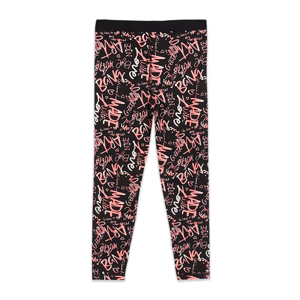 Яркие лосины понравятся любой девочке. Они подойдут для прогулок, занятий спортом, успешно справятся с функцией домашней одежды. Модель оформлена в контрастных тонах, привлекает внимание разноцветными графическими надписями на темном фоне. Высокая посадка и упругая резинка в поясе исключают нежелательное смещение изделия. Аккуратные соединительные швы не врезаются в кожу, не натирают ее.