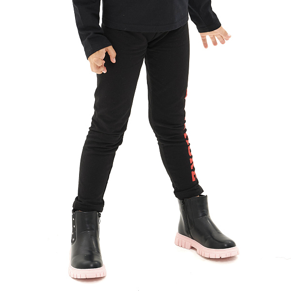 Лосины для девочки выполнены в строгом черном цвете. Спереди на левой ноге расположена яркая красная надпись «LOVE MORE», которая привлекает внимание и добавляет стиля образу. Модель плотно облегает ножки и отлично сидит благодаря эластичному материалу.