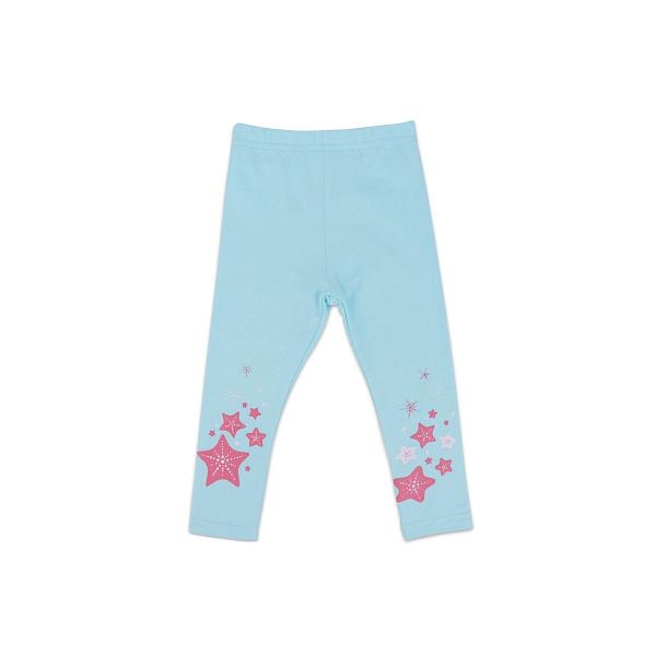 Легкие эластичные лосины нежного голубого цвета понравятся каждой принцессе. Такой предмет гардероба будет органично сочетаться с майками, топами и футболками. В составе ткани использован хлопок с добавлением эластана - это обеспечивает не только естественную вентиляцию воздуха и эластичность, но и комфорт. такие лосины легко сядут на фигуру любого типа, не сковывая движений в процессе носки. Завершает образ красочная звездная вышивка в нижней части штанин.