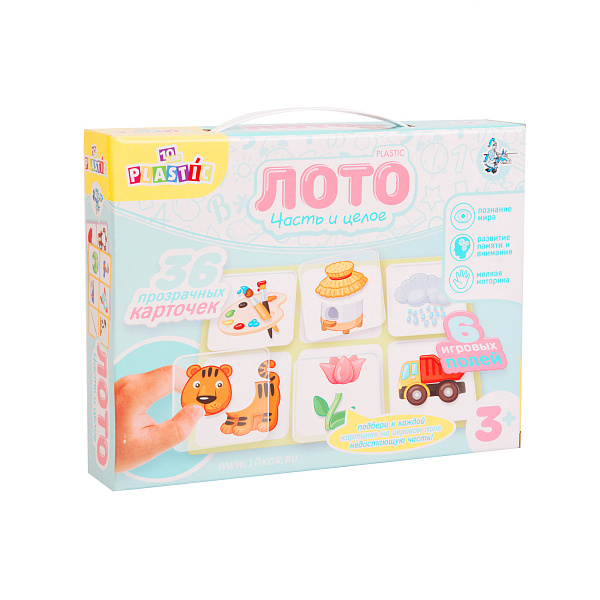 В развивающей серии настольных игр «Десятое королевство» детям старше 3 лет особенно понравится лото «Часть и целое». С одной стороны это игра, по смыслу похожая на пазлы — нужно найти подходящий по значению, цвету и форме элемент. В этом наборе представлено 36 различных картинок с недостающими деталями, которые нарисованы на прочном картоне — по 6 штук на каждом листе. И такое же количество перемешанных карточек из прозрачного пластика, на каждой из которых присутствует та самая недостающая часть. Нужно найти пару и совместить их так, чтобы изображение стало целым. Это тренировка памяти, познание окружающего мира, развитие логики, моторики и немного терпения. Рекомендовано для детей старше 3 лет.
