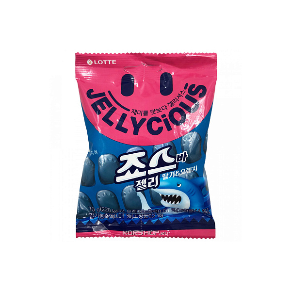 Жевательный мармелад Jellycious придется по вкусу любителям восточных лакомств. Он выполнен в «морском» стиле, на упаковке изображение акулы в океанской глубине. Каждая конфетка исполнена в виде зуба акулы.