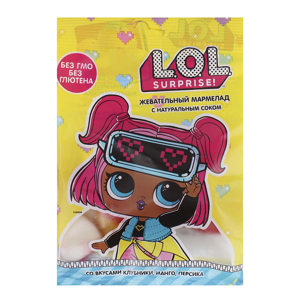 Мармелад «LOL Surprise» с натуральным соком — это вкусное угощение, объединяющее любимые фруктовые ароматы. В состав входят натуральные соки клубники, персика и манго, что придает мармеладу яркий и освежающий вкус, делая его полезным и приятным лакомством.