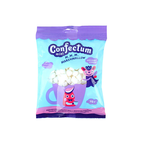 Маршмеллоу небольшого размера порадуют нежным запахом пломбира. Они приятно тают во рту, отлично дополнят чашечку чая или кофе. Угощение можно использовать для украшения десертов или домашнего мороженого. Для производства применяется патока, сахар, кукурузный крахмал, желатин, вода, ароматизатор. Калорийность составляет 330 ккал.