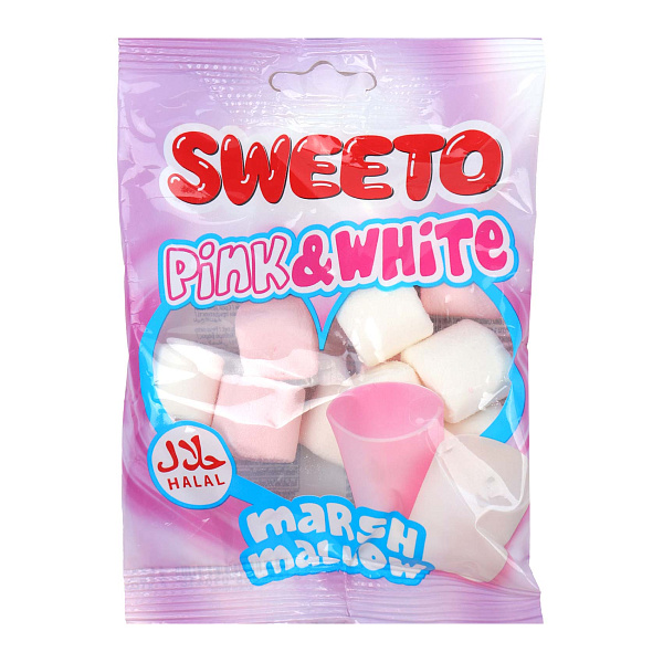 Маршмеллоу SWEETO - это нежный и воздушный десерт в форме кубиков двух цветов: розового и белого. Упаковка выполнена в пастельных розово-белых тонах с изображением маршмеллоу, что подчеркивает их мягкость и сладость.