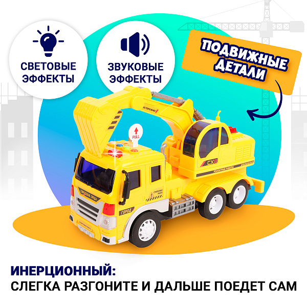 Главные преимущества этого экскаватора — световые и звуковые эффекты, которые активируются при движении. Включаются мигалки и звучат реалистичные звуки двигателя, создавая иллюзию работы настоящей техники. Фрикционный механизм обеспечивает лёгкое движение вперед — достаточно немного толкнуть машину, и она самостоятельно поедет. Эта игрушка развивает у детей координацию движений, моторику, воображение и навыки ролевой игры.