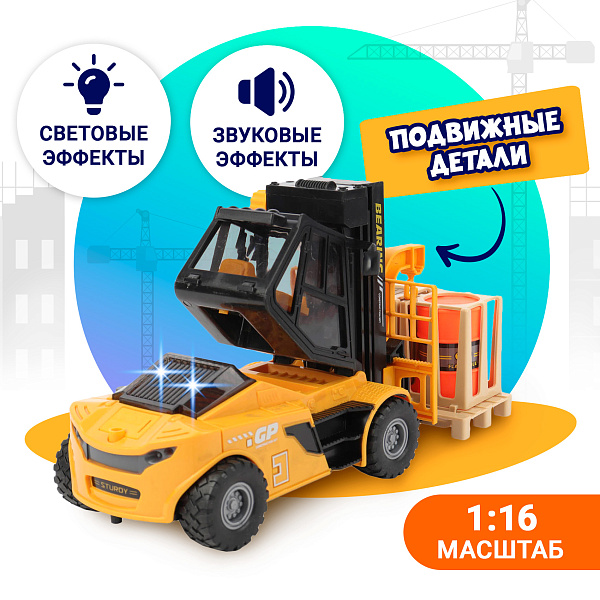 Игрушечная машина «Погрузчик» со светом и звуком. Выполнена в масштабе 1:16. Это интерактивная модель с подвижными элементами, повторяющими реальную технику. У погрузчика открывающаяся кабина и специальный раскладывающийся подъемный механизм, на котором установлен поддон с грузом. Игрушка изготовлена в ярких цветах, характерных для строительной техники.
