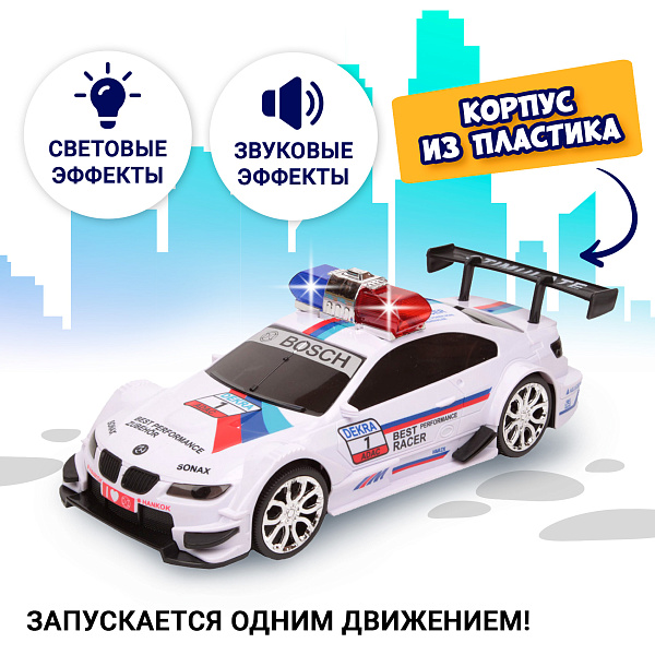 Машинка изготовлена в виде гоночного кара со всеми соответствующими атрибутами: спойлером на багажнике, заниженной посадкой и обтекаемой формой. Машинка раскрашена в полицейские цвета с преобладанием белого. Механический моторчик, знакомый многим с детства, позволит запускать машину в погоню за преступниками одним движением.