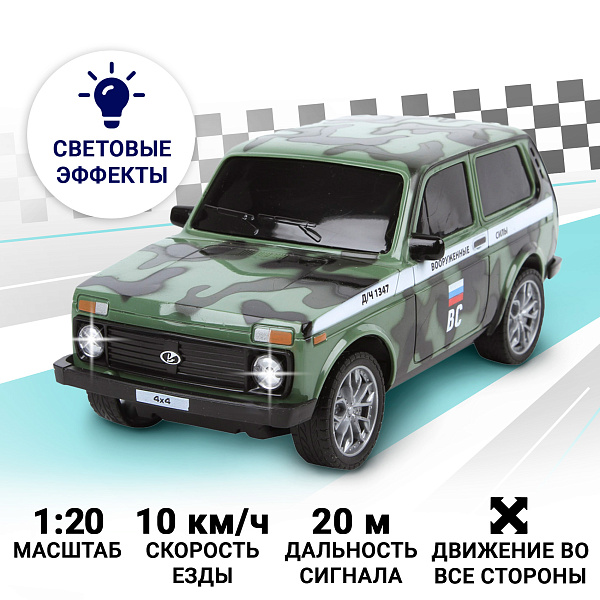 Машина на радиоуправлении LADA 4X4 от ТЕХНО ПАРК. Модель выполнена из пластика с раскраской в стиле милитари. Благодаря реалистичной детализации, наличию мелких деталей и светящимся фарам автомобиль выглядит в точности как настоящий.