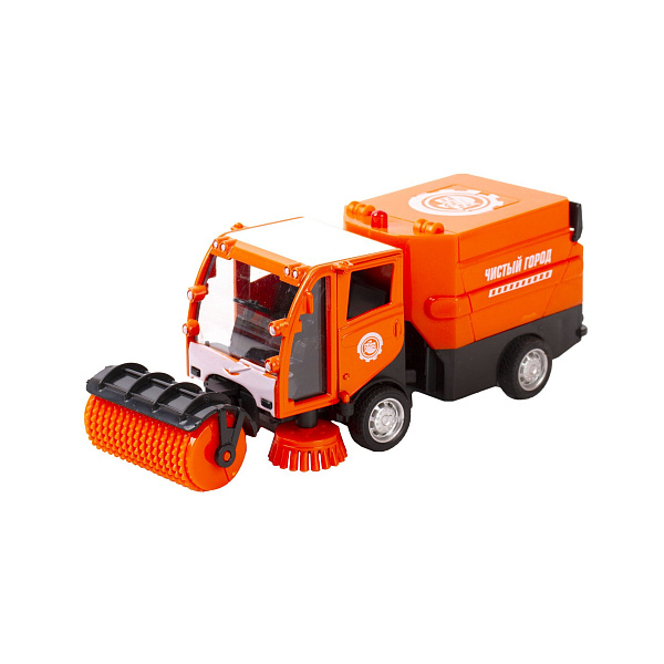 Игрушечная машинка полностью повторяет вид настоящего уборочного авто. Металлический автомобиль яркого оранжевого тона с реалистичным кузовом с белой надписью «чистый город», с аналогичного оттенка щелками и шиповкой спереди и сзади. Все двери и багажник машинки открываются. Миниатюрная модель работает по принципу инерционного механизма (продолжит движение при толчке или если малыш будет долго ее катать). Ребенок будет использовать игрушку для имитации работы уборочной машины. Если Вы купите другие модельки из коллекции, малыш устроит гонки. Предназначена для детей старше 3 лет.