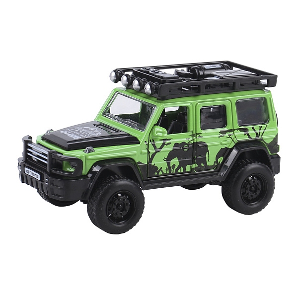 Металлическая инерционная машинка представлена в ассортименте цветов, включая насыщеный зеленый, бежевый и белый. Каждая машинка выполнена в масштабе 1:32 и привлекает внимание оригинальным дизайном: ее кузов декорирован изображениями животных и лесного пейзажа, что добавляет изделию атмосферу приключений и сафари.