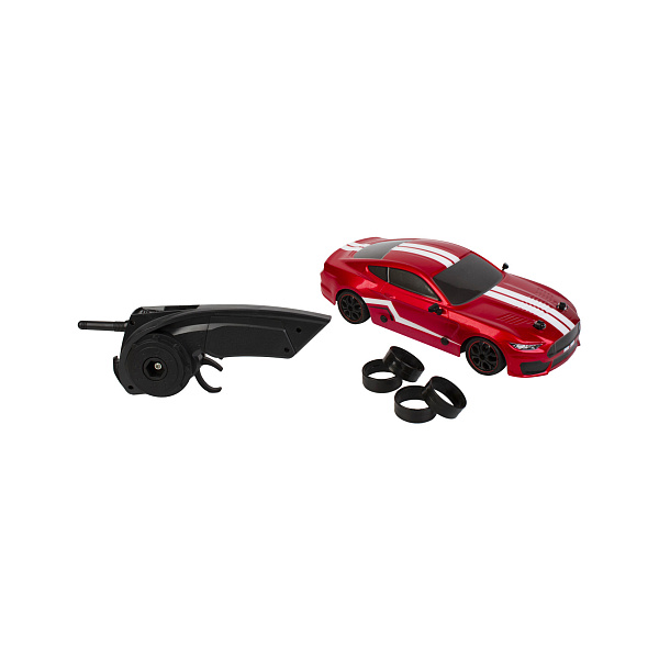 Пульт управления пистолетного типа, черный. Машина яркая глянцевая, расцветка может быть разная. Двигатель 2,4 ГГц позволяет развивать высокую скорость для выполнения заносов не хуже, чем в популярных фильмах.