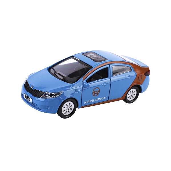 Миниатюрная игрушечная машинка Kia Rio. У нее металлический корпус синего цвета с надписью каршеринг по бокам. Двери и багажник открываются. У машины установлены фары, приклеены маленькие логотипы компании. Она выглядит совсем как настоящая, только уменьшенная копия реального автомобиля.