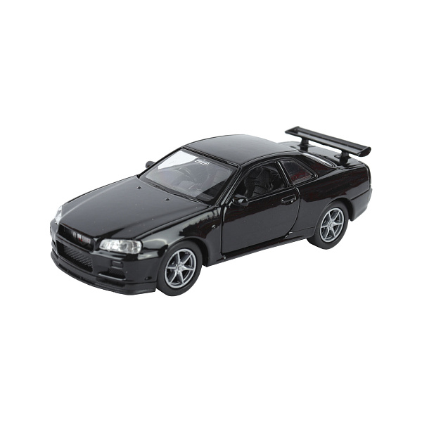 Крутая инерционная машинка Nissan Skyline GT-R R34. Корпус модели выполнен из металла с дополнительными пластиковыми элементами. У игрушки точная детализация: передние двери открываются, сзади на капоте прикреплен спойлер, есть миниатюрные фары, зеркала заднего вида, в салоне установлены сидения и руль.