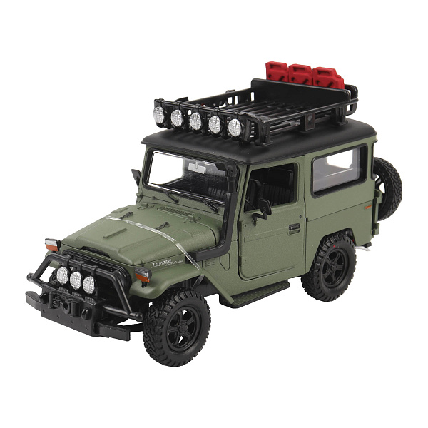 Модель автомобиля Toyota FJ40 Off Road в масштабе 1:24 выполнена из высококачественного металла с пластиковыми дополнениями, что обеспечивает прочность и детальность исполнения. Автомобиль покрыт матовой оливково-зеленой краской, что придает ему характерный внешний вид настоящего внедорожника. На крыше установлен багажник с дополнительным оборудованием, включая канистру и фонари.