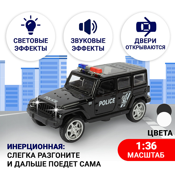 Миниатюрная игрушечная машинка в размере 1:36 со звуковыми и световыми эффектами. У модели металлический корпус и пластиковые колеса. Передние боковые двери открываются. Внешне машина повторяет полицейские внедорожник. На крыше установлены мигалки, а на корпусе есть наклейка с надписью «Полиция». Машинка хорошо детализирована, есть много мелких оригинальных элементов.