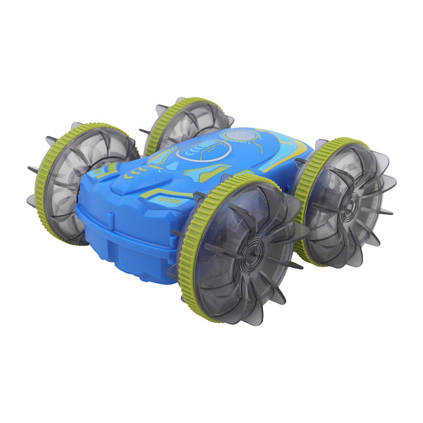 Машинка трюковая амфибия поражает своей необычной синей расцветкой с яркими желтыми и зелёными акцентами, которые делают игру зрелищной и динамичной. В форме компактного вездехода это устройство оснащено четырьмя большими четырёхслойными колесами, готовыми легко справиться с разными поверхностями — от песка и камней до воды. Яркая подсветка добавляет эффектности и позволяет использовать машинку даже в условиях плохой освещённости.