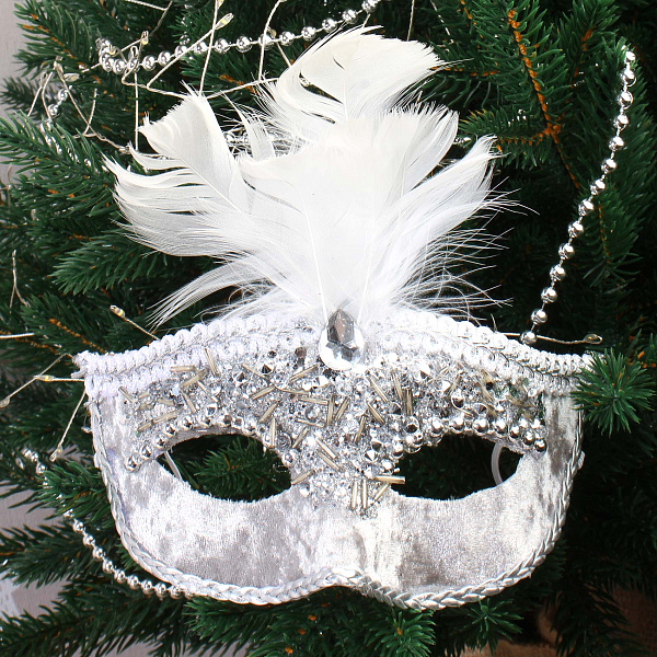 Карнавальная венецианская маска в винтажном серебряном исполнении — элегантное украшение, способное стать изысканным дополнением к праздничному образу или стильным элементом декора. Мягкий велюровый материал привносит благородство и тепло, а богатая отделка из блестящих пайеток, бусин и перьев создает ощущение утонченной роскоши и загадочности.