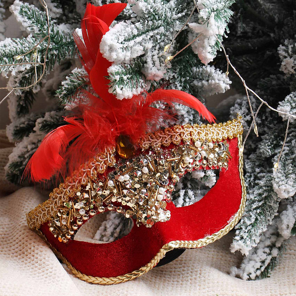 Карнавальная венецианская маска в винтажном красном исполнении — элегантное украшение, способное стать изысканным дополнением к праздничному образу или стильным элементом декора. Мягкий велюровый материал привносит благородство и тепло, а богатая отделка из блестящих пайеток, бусин и перьев создает ощущение утонченной роскоши и загадочности.
