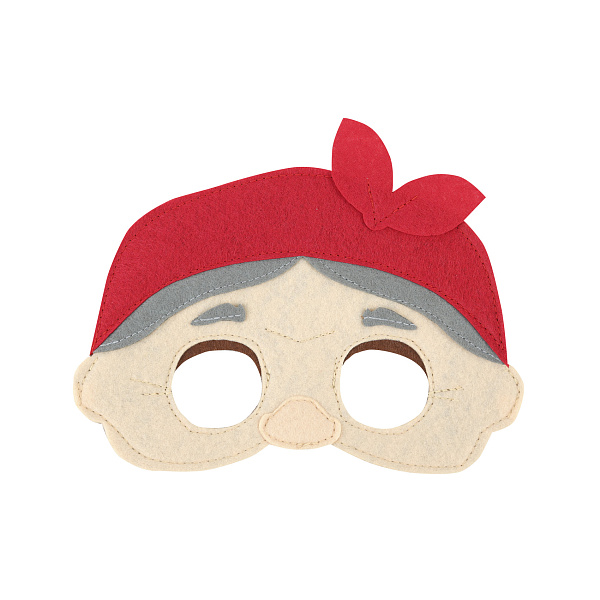 Детская театральная маска БАБКА из фетровой ткани. Материал яркий и износостойкий, поэтому маска прослужит много лет, не потеряв первоначальный внешний вид. Для ее создания использовался фетр разных цветов, чтобы правильно отразить облик персонажа. У бабушки выпуклый нос, седые волосы и красный платок. Завязывается на затылке с помощью двух шнурков. Большие отверстия для глаз обеспечивают хороший обзор.