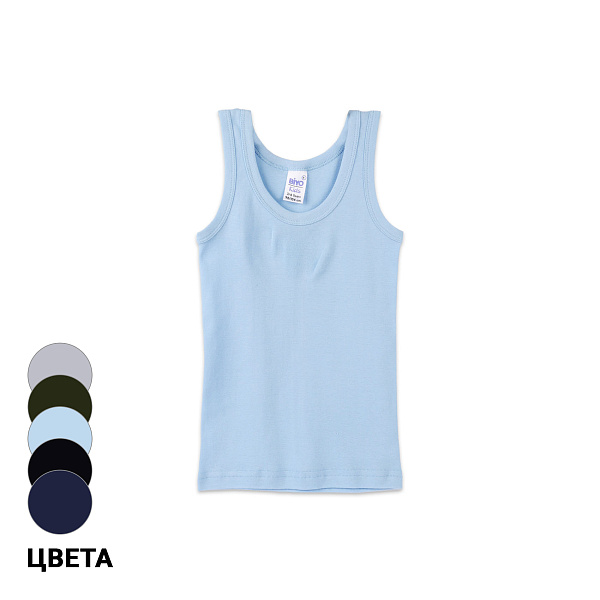 Однотонная майка органично впишется в сезонный гардероб мальчика дошкольного возраста, обеспечит ему комфорт. Модель классического кроя имеет широкие лямки, которые не сползают с плеч во время активных игр. Для оформления выбрана практичная цветовая гамма.