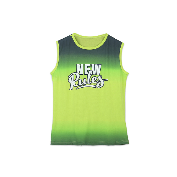 Порадуйте маленького спортсмена стильной майкой свободного кроя. Изделие не сковывает движения за счет отсутствия рукавов, а широкие лямки не перекручиваются. Зеленый градиентный цвет понравится ребенку и добавить акцента в образ. В основе ткани использован натуральный хлопок и эластан – сочетание материалов обеспечивает упругость ткани, ее мягкость, комфортное прилегание и хорошую проводимость воздуха. Вырез горловины круглый, обработан ярко-зеленой окантовкой. Переднюю часть майки украшает белая надпись «Новые правила». Рекомендовано для детей дошкольного и школьного возраста.