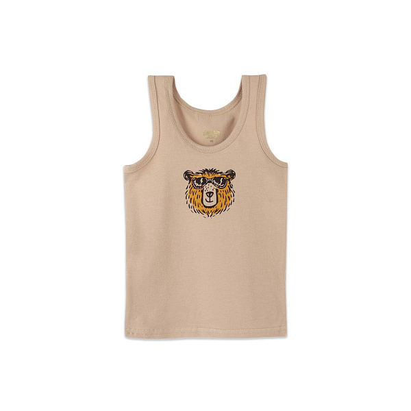 Классическая повседневная майка для мальчика бежевого цвета. Спереди у нее нанесен рисунок в виде милой морды веселого медведя. У изделия свободный крой, который не стесняет движения ребенка и не мешает его активным играм. Материал мягкий и приятный к телу. В его составе натуральный хлопок, который дает коже дышать и обеспечивает необходимую терморегуляцию тела. Ткань достаточно прочная и эластичная. Подходит для ежедневного использования.