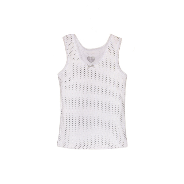 Классическая белая трикотажная майка универсальна и подойдет как под светлые вещи, так и темные. Натуральный хлопок, использованный в основе материала, хорошо пропускает воздух, приятно прилегает к телу, бережно сохраняет тепло и дарит комфорт в процессе носки. Ткань майки украшена в черный мелкий горошек, в овальный вырез на горловине украшен изящным бантиком. Лямки майки средней толщины. Крой свободный, поэтому изделие не сковывает движения ребенка. Рекомендовано для детей младшего возраста.