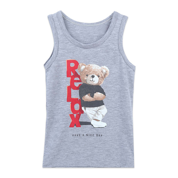Майка для мальчиков выполнена из мягкой и эластичной ткани, состоящей из хлопка и эластана, что обеспечивает комфортную посадку и свободу движений. Модель серого цвета украшена ярким и милым принтом с изображением медвежонка в стильной одежде и текстом «Relax» и «Have a nice day», придающим изделию игривый и позитивный характер. Классический фасон майки с широкими плечевыми ремешками обеспечивает удобство в носке и подходит для повседневного использования.