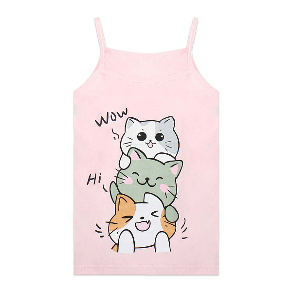Майка для девочки светло-розового цвета — это удобная и стильная вещь, которая станет отличным дополнением к повседневному гардеробу ребёнка. Изделие выполнено из мягкой и приятной на ощупь ткани, которая удобно сидит по фигуре и обеспечивает комфорт в течение всего дня. Майка украшена забавным и милым принтом с изображением трёх весёлых котят, который добавляет яркости и оригинальности образу.
