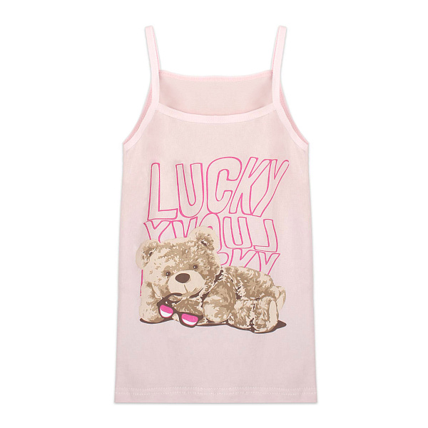 Милая майка для девочки нежно-розового цвета станет прекрасным дополнением в гардероб маленькой модницы. Нежный оттенок универсален и легко сочетается с другими вещами, а забавный принт с медвежонком и яркой надписью «Lucky» придает изделию особое очарование. Мягкая и приятная на ощупь ткань с аккуратным пошивом делает майку не только красивой, но и комфортной для повседневной носки.