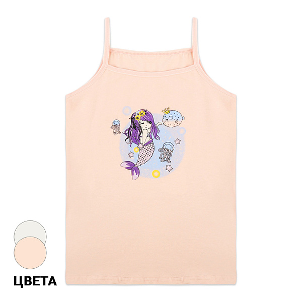 Это детская майка в базовых цветах выполнена из мягкого трикотажа, приятного для кожи ребенка. Майку можно сочетать с другой детской одеждой или носить в качестве первого слоя. В центре изделия расположен красочный принт с изображением русалки, окруженной морскими обитателями и пузырьками.