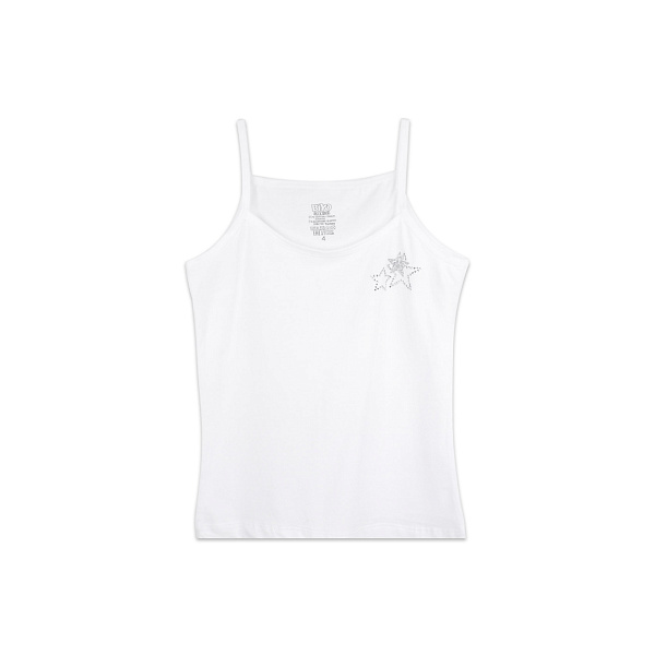 Изящная белая майка с тонкими бретелями будет с радостью принята любой девочкой дошкольного возраста. Ребенок по достоинству оценит комфортную посадку и сверкающее украшение на груди. Соединительные и отделочные швы выполнены очень аккуратно, не способны вызвать раздражение кожи. Классический крой обеспечивает свободу движений, упрощает процесс переодевания.