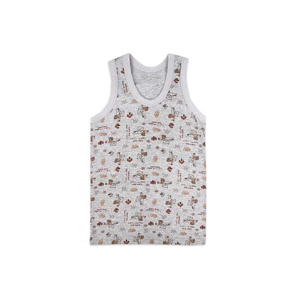 Светло-серая майка с ненавязчивым принтом в виде маленьких мишек и надписей в разных цветах понравится маленькому ребенку. Внутри вещь приятного серого цвета, поверхность гладкая и не будет колоть или травмировать кожу. Легкая и приятная на ощупь майка подарит комфорт в процессе носки. Прочная строчка не расползется после многочисленных стирок или активных игр на улице.