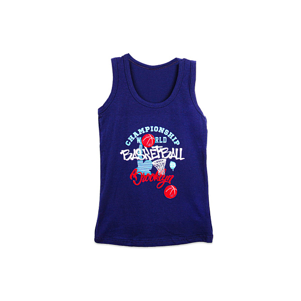 Яркая темно-синяя майка спортивного покроя с эмблемой баскетбольного чемпионата для мальчика 5-7 лет изготовлена из натурального хлопка с небольшим добавлением эластана. Ткань чудесно облегает фигуру, придавая ребенку спортивные черты. Тщательно обработанные швы и горловина придают майке дорогой вид.