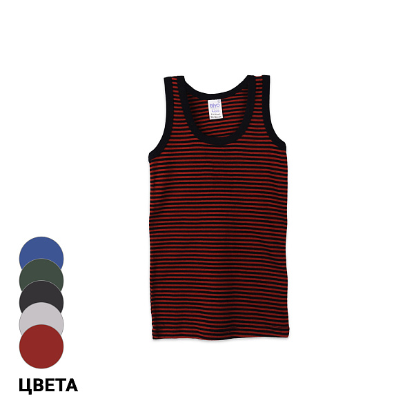 Удобная майка является неотъемлемым элементом гардероба дошкольника. Модель классического кроя оформлена в практичной цветовой гамме. Узкие полоски перекликаются с однотонной окантовкой горловины и проймы. Широкие лямки не сползают во время активных игр.