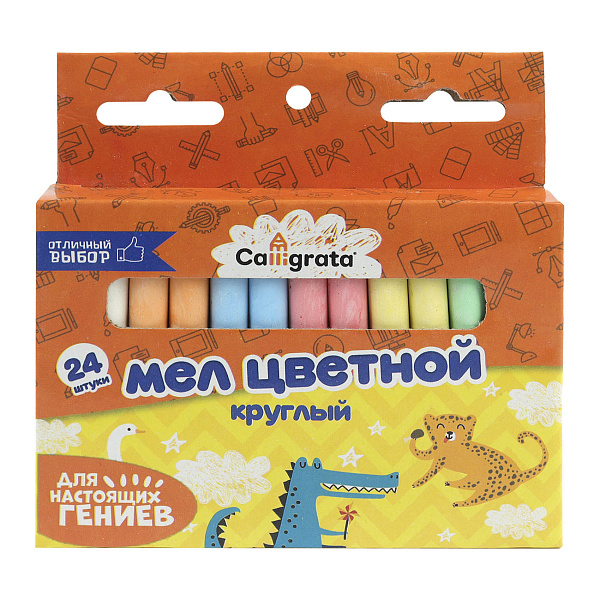 Яркие цветные мелки CALLIGRATA круглой формы для школы и дома. Набор из двадцати четырех мелков шести разных цветов. Рисовать ими можно на мелованной доске, асфальте или другой шероховатой поверхности. Оттенки яркие, картины с ними получаются по-летнему сочные и насыщенные.