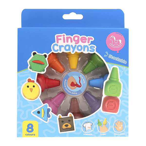 Восковые мелки на пальцы — идеальный инструмент для детского творчества. Набор включает восемь ярких мелков разных цветов: желтый, оранжевый, красный, фиолетовый, синий, зеленый, розовый и коричневый. Основание в виде кубика удобно для маленьких пальчиков, упрощая удерживание и превращая рисование в увлекательную игру.