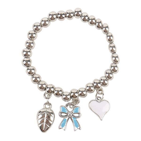 Металлический браслет с подвесками станет стильным дополнением к гардеробу юной модницы. Изготовлен из прочного металла, браслет украшен тремя подвесками в виде листика, бантика и сердечка. Каждая подвеска выполнена с точной проработкой деталей.