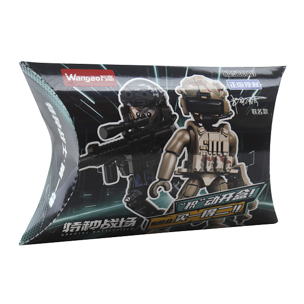 Мини-конструктор «Солдатики» включает одну из двух фигурок в военной форме. Одна фигурка одета в черный камуфляж с шлемом и приборами ночного видения. Вторая — в песочный камуфляж с тактическим жилетом и маской. Обе держат оружие. Фигурки собираются из мелких деталей. Каждая часть плотно соединяется с другой.