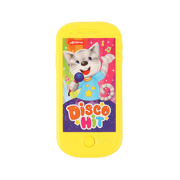 Игрушка в виде смартфона «DISCO HITS» выполнена в корпусе желтого цвета и с изображением поющего в микрофон котика. Нажав на кнопку, можно включить 7 разных песен, что поспособствует музыкальному развитию ребенка.