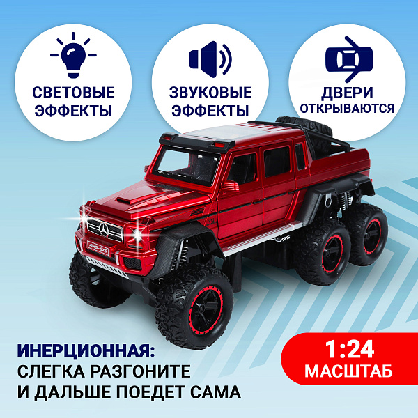 Металлическая модель пикапа Mercedes-Benz G-Класс AMG 6x6 понравится юному коллекционеру. Она с точностью до самых мелких деталей повторяет свой реальный прототип в соотношении 1:24. Корпус автомобиля покрыт глянцевой красной краской с черными деталями. Каждая дверь машины, капот открываются. Детализированный салон выполнен в черном цвете. В открытом багажнике пикапа лежит запасное колесо.