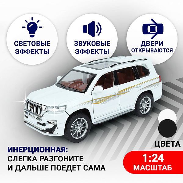 Металлическая модель внедорожника Toyota Land Cruiser Prado понравится юному коллекционеру. Она с точностью до самых мелких деталей повторяет свой реальный прототип в соотношении 1:24. Корпус автомобиля покрыт глянцевой белой краской. Каждая дверь машины, капот и багажник открываются. Детализированный салон выполнен в теплом коричневом цвете.
