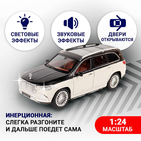 Модель авто Maybach AMG GLS63 в масштабе 1:24 — это великолепно детализированная игрушка, выполненная из высококачественного металла белого и черного цветов. Корпус автомобиля прочный и реалистичный, что придает модели особую привлекательность. У этой модели открываются двери, капот и багажник, что добавляет интерактивности и делает игру более захватывающей.