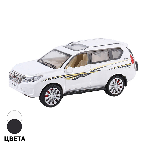 Металлическая модель джипа с открывающимися дверями представлена в стильном ассортименте цветов: строгий черный и эффектный белый. Каждый автомобиль выделяется точной детализацией, создающей максимально реалистичное впечатление. Декоративные элементы в виде графических линий подчеркивают динамичный и современный образ модели.